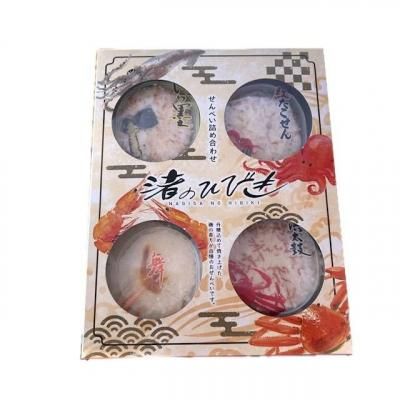[原材料名] 【舞】 澱粉(国内製造) えび, 植物油、食塩、 還 元水飴/加工澱粉、調味料(アミノ酸等)、トレハロース、甘 味料(ステビア、カンゾウ), 膨張剤、着色料(紅麹、パプリカ 色素) (一部にえびを含む) 【浜太鼓】 澱粉(国内製造)、ほ でし身(魚肉澱粉、植物蛋白、食塩、植物油脂), 植物油 え び、かに、カニエキス、食塩、砂糖/調味料(アミノ酸等) ルビトール、甘味料(ステビア、カンゾウ)、酸化防止剤(V. E), トレハロース、着色料(紅麹)、香料、膨張剤、(一部にえ び・かに・小麦・大豆を含む) 【いか墨】 澱粉(国内製造) いか、いかずみ(コーンスターチ、澱粉、 いかすみ、砂糖、食 塩)、植物油、食塩、黒ごま、一味唐辛子、還元水飴、蛋白加水 分解物/加工澱粉、調味料(アミノ酸等), トレハロース、甘 味料(ステビア, カンゾウ), 着色料(黄5) 膨張剤、(一部 小麦・いか・大豆・ごまを含む) 【紅たこ】 澱粉(国内 造), いか たこ, 植物油、食塩、ほたてエキスパウダーほ てエキス, デキストリン、蛋白加水分解物、醤油、魚醬、食塩) 醸造調味料、一味唐辛子、還元水飴、蛋白加水分解物/ 工澱粉、調味料(アミノ酸等)、トレハロース、甘味料(ステ ビア, カンゾウ)、膨張剤、カラメル色素、(一部に小麦・い か・大豆を含む)